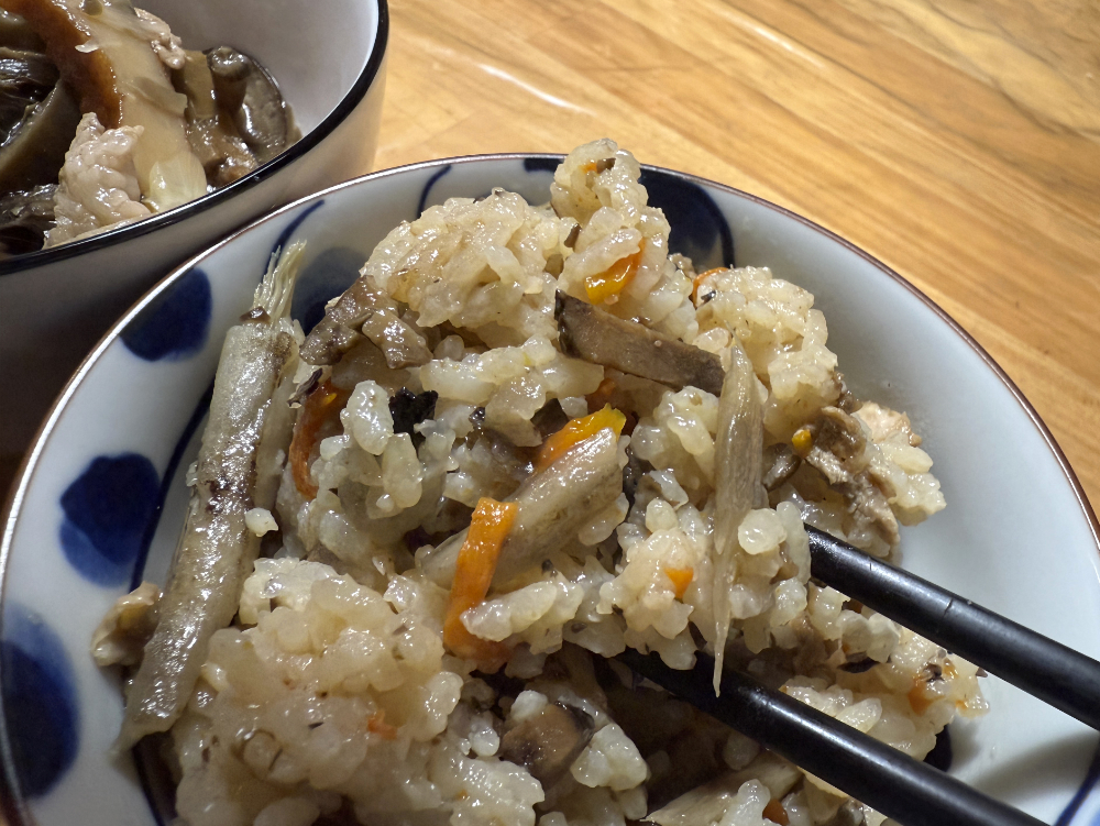 刻んで甘辛く煮含めたハツタケを他の味付けた具材と一緒に炊き立てご飯に混ぜ込んだ一品